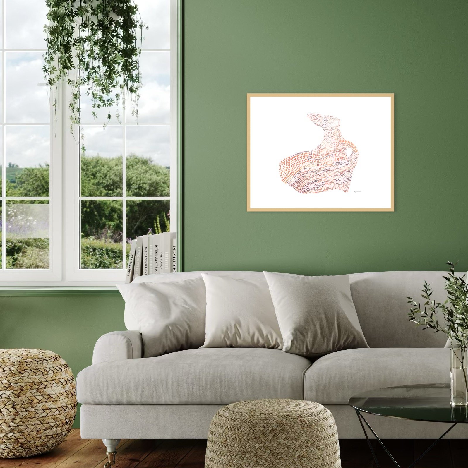 form #39 is a meditative dot painting composed of hundreds of hand-painted ovals in warm, earthy hues—burnt orange, ochre, and reddish-brown. These marks gather into an abstract, vessel-like shape that rises gently from the page, its upper left extension curving upward like a tendril or flame. The form feels both anatomical and celestial, evoking a heart, a seed pod, or a sacred container.