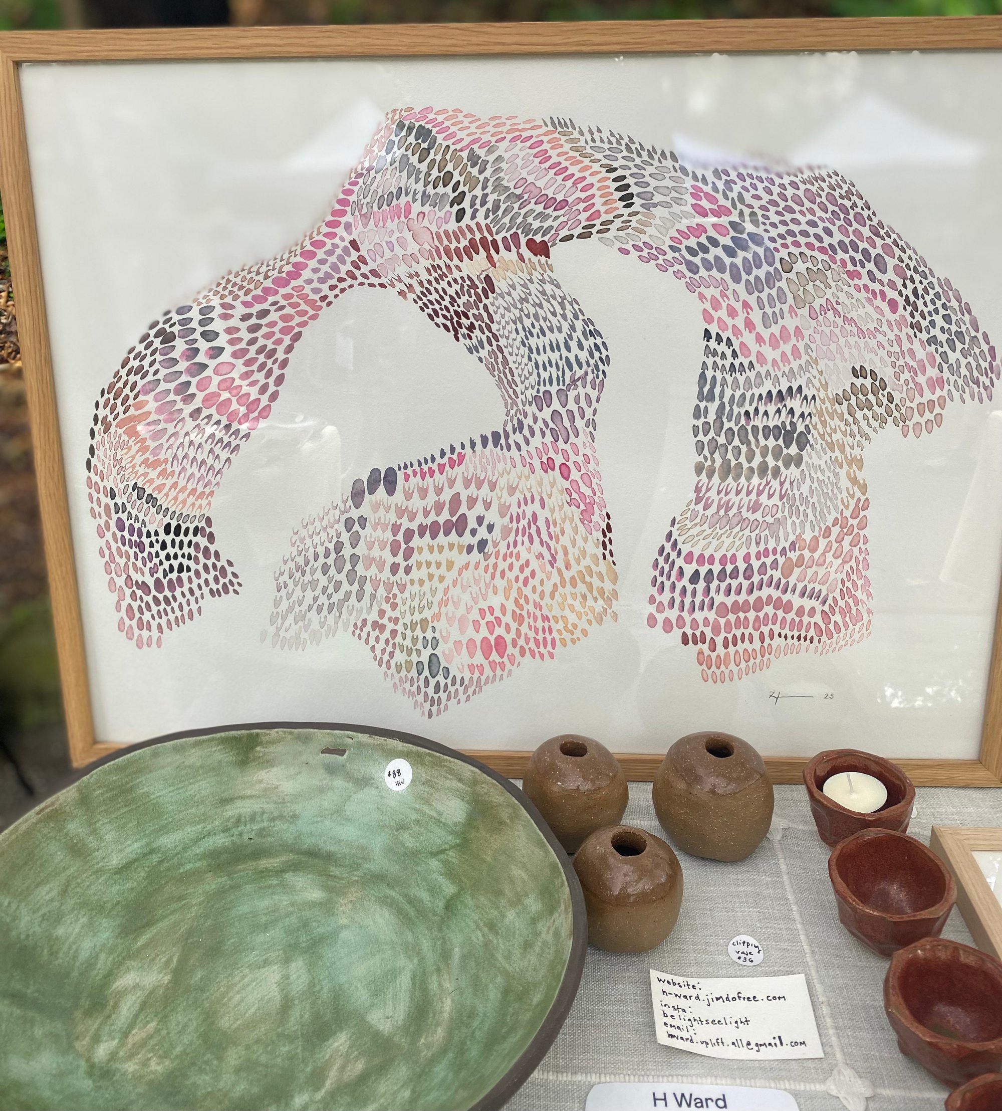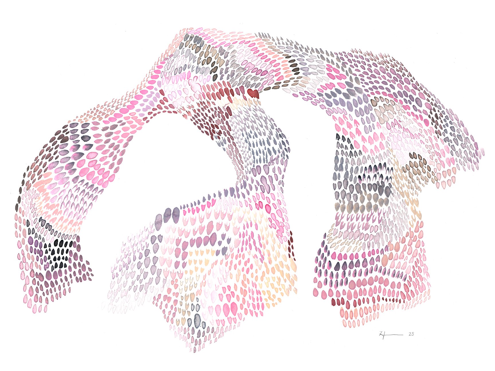 form #53 brings a mesmerizing wave of textured, oval marks flow across the paper in harmonious unique sections. The palette is dreamy and soothing—mauves, blush pinks, dusty purples, and soft grays interweave gently. Each mark made is distinct yet interconnected, creating a surface that feels both organic and deliberate- scales of light or petals caught in motion. There’s a sense of serenity and movement, as if the painting breathes with quiet energy. It will draw you in slowly—inviting reflection, calm, wonder.