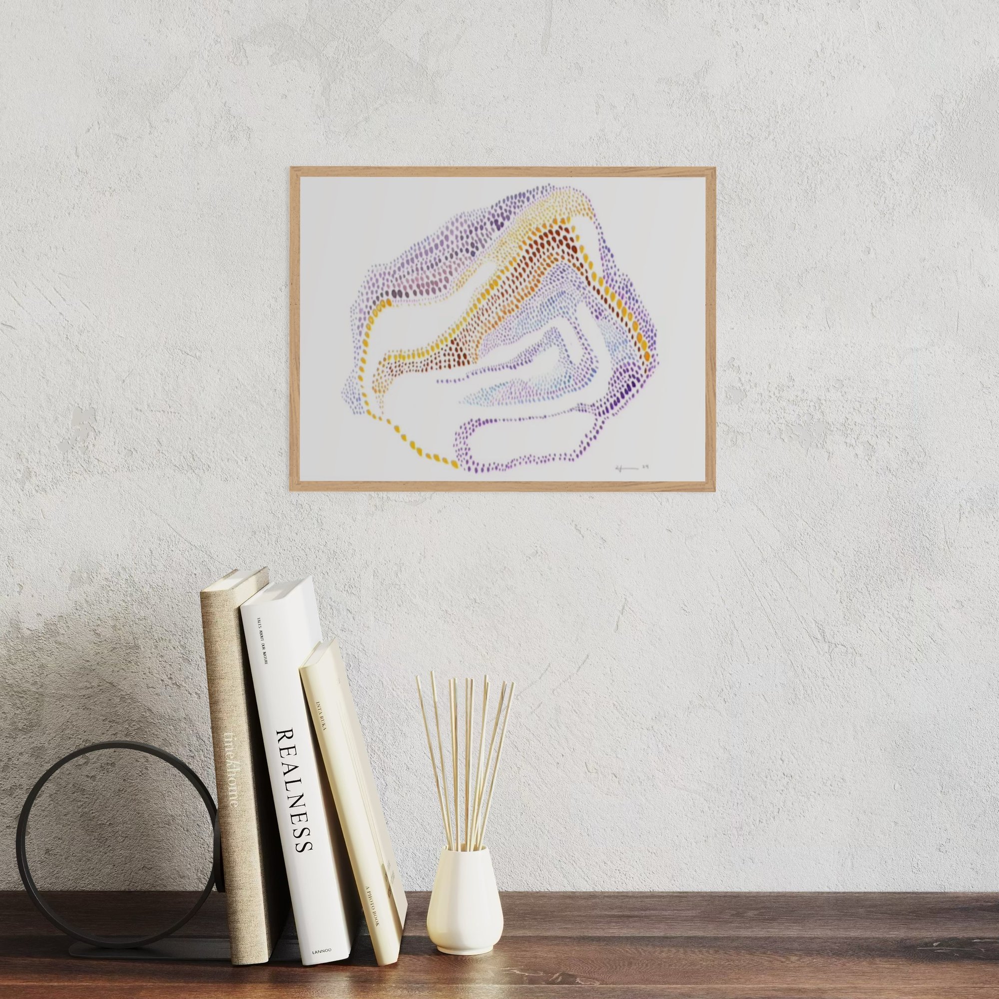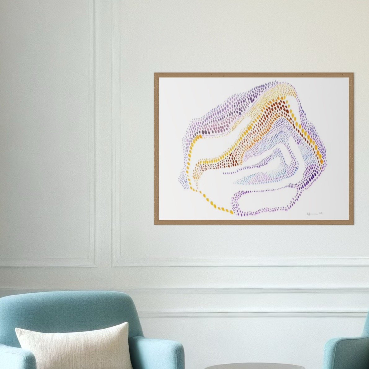 This piece unfolds in a constellation of hand-painted dots—purples, yellows, browns, and blues—gathered into an irregular, fluid form that feels both geological and celestial. The gradient of color and density creates a sense of movement and depth, like a terrain shaped by breath or memory.