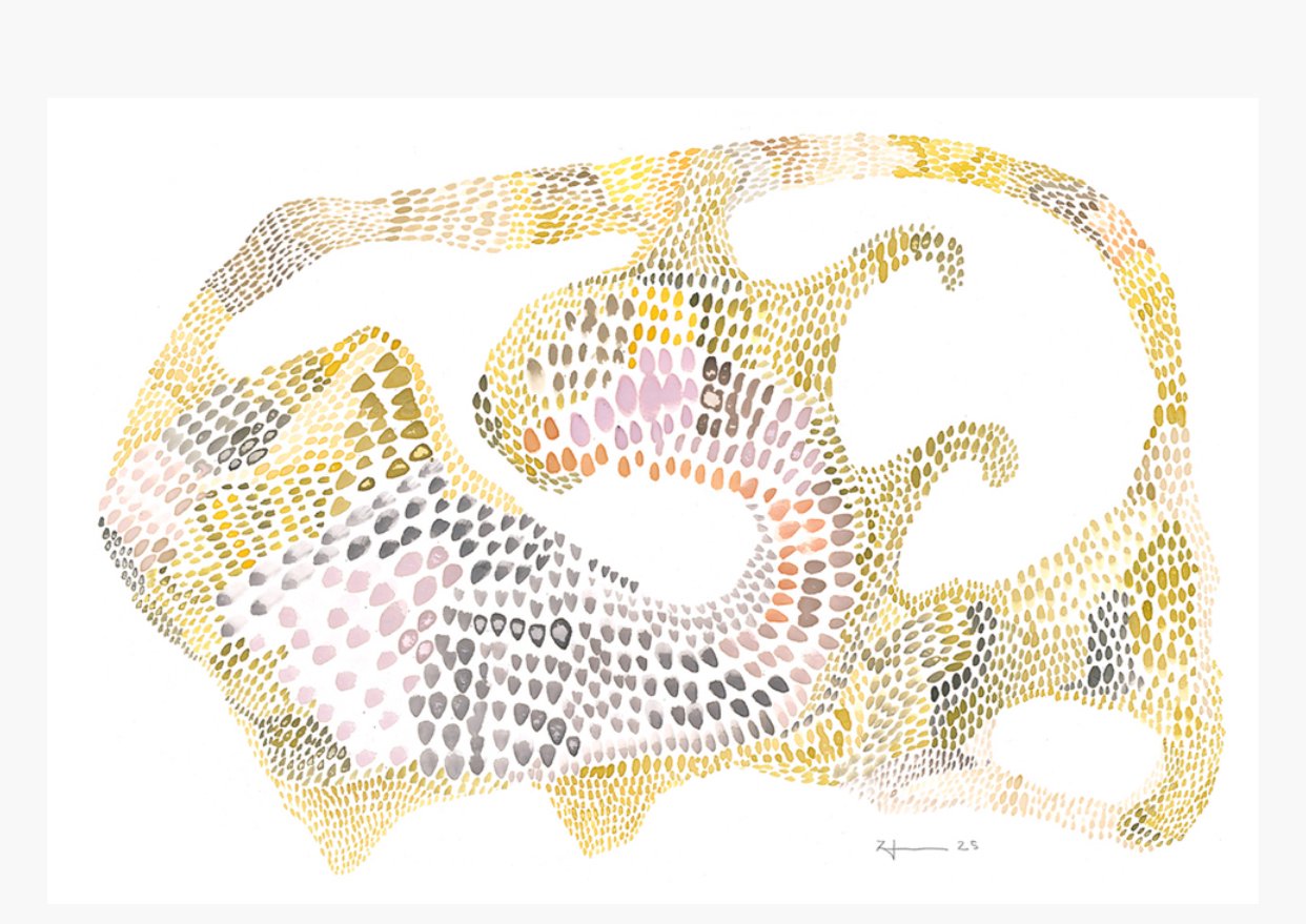 This radiant artwork is composed of hundreds of individually painted dots in warm yellows, soft grays, earthy browns, and gentle pinks. Their organic arrangement flows across the surface like a quiet stream, forming a mosaic of movement, texture, and light. Each dot feels intentional yet spontaneous—part of a larger rhythm that evokes breath, growth, and the subtle pulse of nature.