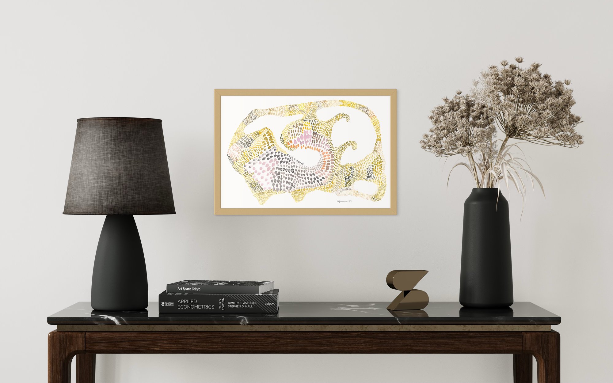 The overall effect is both meditative and uplifting, offering viewers a moment of stillness while suggesting motion beneath the surface. This piece adds a touch of quiet vibrancy and modern serenity to any space.