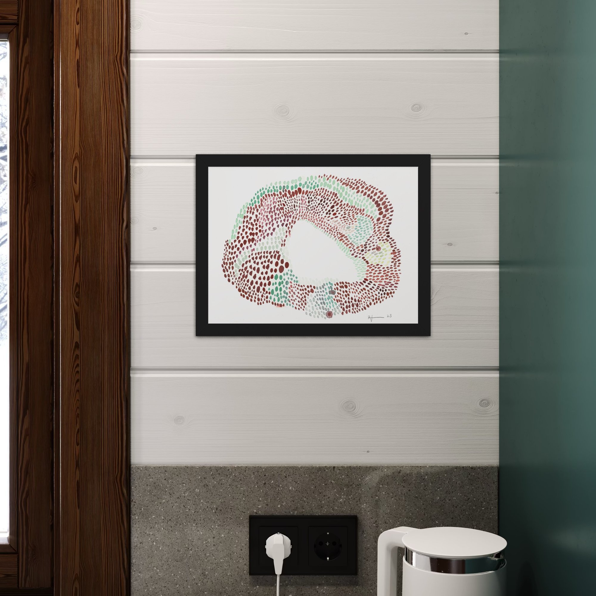 form #62 is a celebration of color and rhythm—an abstract composition of oval-shaped dots in reds, greens, pinks, and yellows, arranged in a loose circular formation. The marks pulse outward from a central white space, like a bloom mid-expansion or a dream surfacing. Densely clustered in some areas and airy in others, the piece plays with texture and movement, inviting the eye to wander and rest.