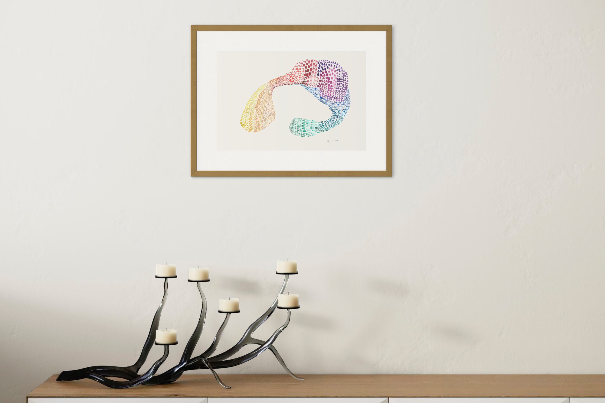 This piece unfolds in a wave-like stream of oval marks, each one a moment of presence. Painted in a radiant gradient—from yellow to orange, red, purple, blue, and green—the dots ripple across the page in fluid motion. The composition evokes breath, rhythm, and transformation, like a ribbon of energy moving through space.