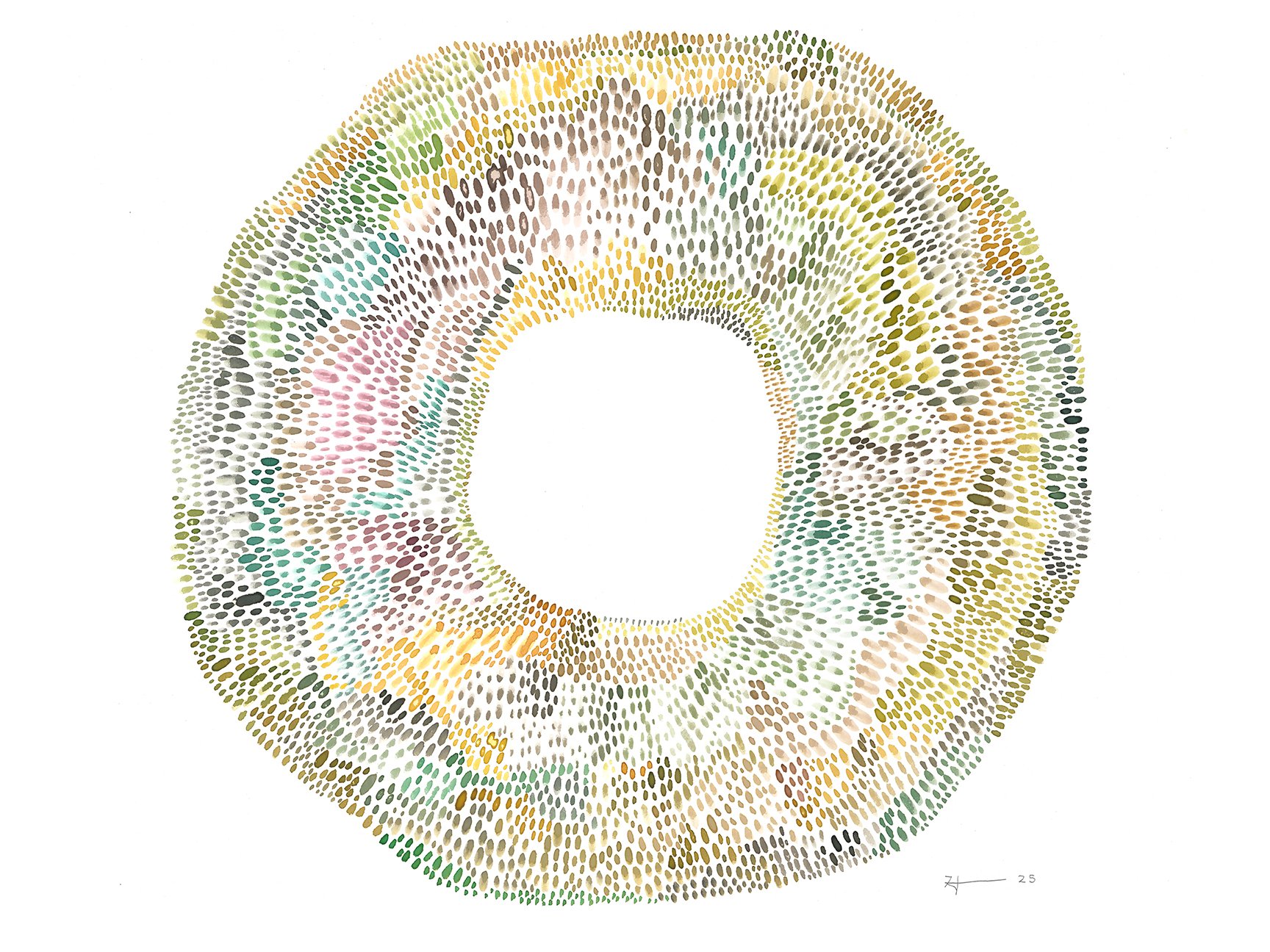 A mesmerizing ring floats at the heart of the canvas—like a cosmic halo or a magnified cell seen under a microscope. The circular form is composed of countless dabs of color, each an oval brushstroke that pulses with life. Warm greens, earthy ochres, soft pinks, deep blues, and golden tones interlace to form a richly textured mosaic. These overlapping strokes create a sense of movement, as if the ring is gently rotating or vibrating with quiet energy.
